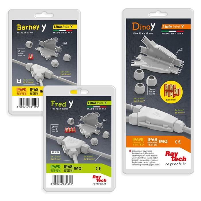 CARACTERISTICI PRODUSDenumire : BARNEY YRamificatii preumplute cu gel Little Joint YPentru etansarea, protejarea si realizarea conexiunilor electrice in conditii de sigurantaMicro-imbinare preumpluta cu gelEchipate cu presetupe si clemeSubmersibilePot fi montate sub pamantRefolosibil si fara termen de expirareGata de utilizare cu dimensiuni reduseHalogen freeRezistenta UVTemperatura de lucru: max.+90°CTemperatura de instalare: -40°C ... +50°SECTIUNI CABLU (n°x mm²)T(in): - 1 x 4 / 1 x 25 SECTIUNI CABLU (n°x mm²)B(out): - 1 x 1.5 / 1.25 CABLU MAXIM Ømin (mm) : 6CABLU MAXIM Ømax (mm) : 10DIMENSIUNI AxBxC(mm) : 88x55x22